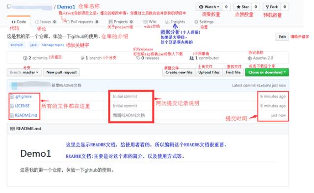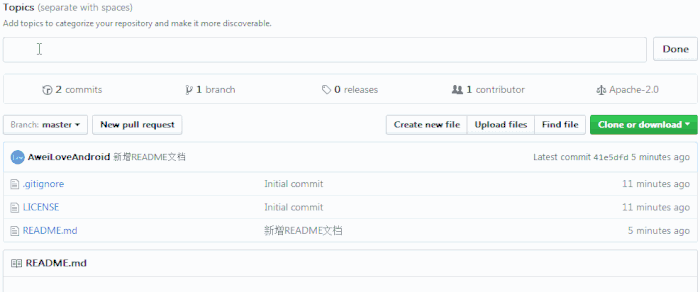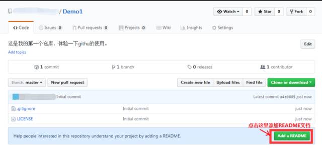 (3)假如创建库的时候忘记了勾选README那个对勾,别着急,创建好了项目之后是这样的(关于各部分都是干嘛的,后文有讲解),看下图:
