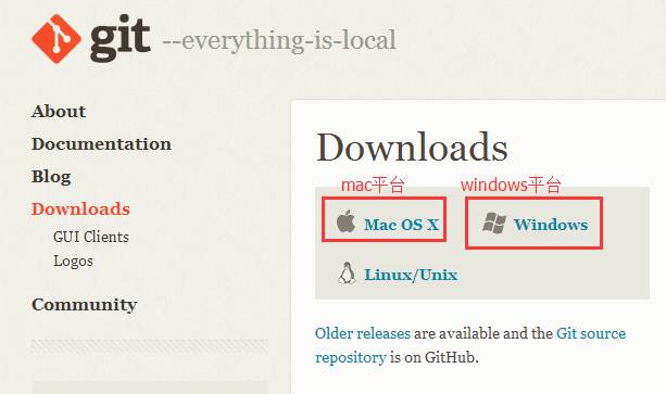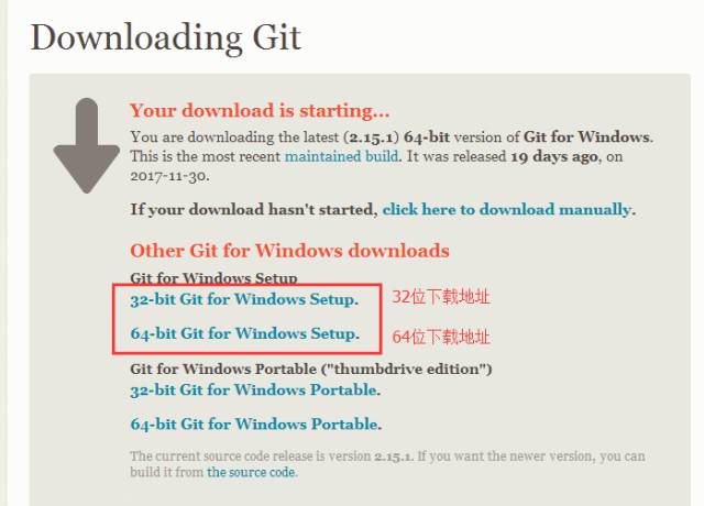 【注意:】如果是windows平台,点击了Windows进去之后,会自动弹窗下载,建议取消,手动去选择win 32位或者64位的去下载,免得你32位的电脑却被下载了64位的git客户端。