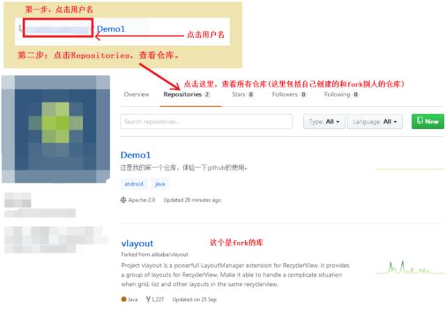 3. 点击左上角的github的logo,然后在右边就可以看到你的所有的库。