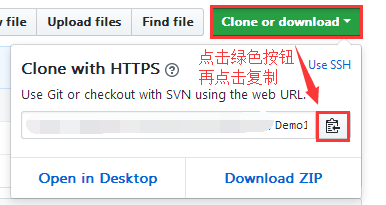 (2)使用git客户端下载github的库,就拿刚才那个Demo1来说吧,打开Demo1,点击绿色按钮,再点击小册子的那个图标,表示复制当前git仓库,如图所示。(如果你喜欢图形化界面,还可以安装一个TortoiseGit,这个不是我现在要讲解的重点,有兴趣的可以去百度一下怎么使用。)